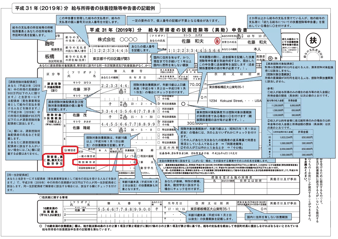 「(19)~(20) 勤労学生、障害者控除」欄に控除額を記入します。