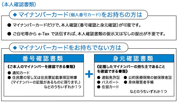 なお、平成28年度分以降の確定申告時、社会保障・税番号(マイナンバー)制度の導入により、確定申告書の提出時に「マイナンバーの記載」+「本人確認書類の提示又は写しの添付」が必要となります。